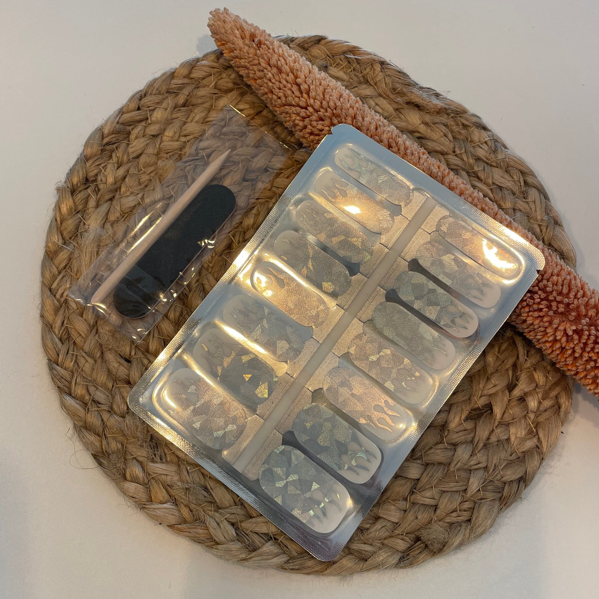 Kijk goed welke maat nailwraps op welke vinger past. Begin bij je pink en werk dan toe naar je duim. Mochten de nailwraps iets te klein zijn, kun je zo voorzichtig oprekken. Te groot is niet mooi in verband met je nagelriemen.